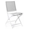 Tuinstoel Edna met wit frame uit aluminium en grijze kussens. Afgewerkt met touw.