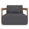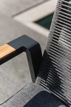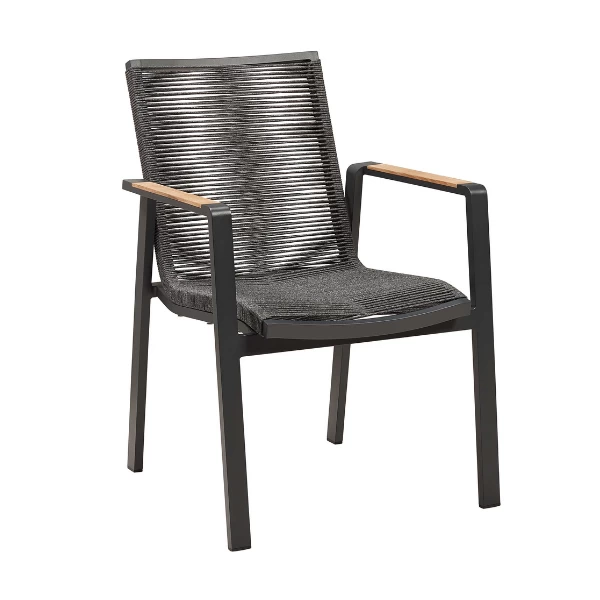 Donkerkleurige tuinstoel Moreno met kader in mat, donkergrijs aluminium. Zitting en rugleuning in olefin, armsteun in teakhout.