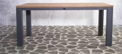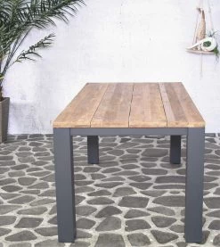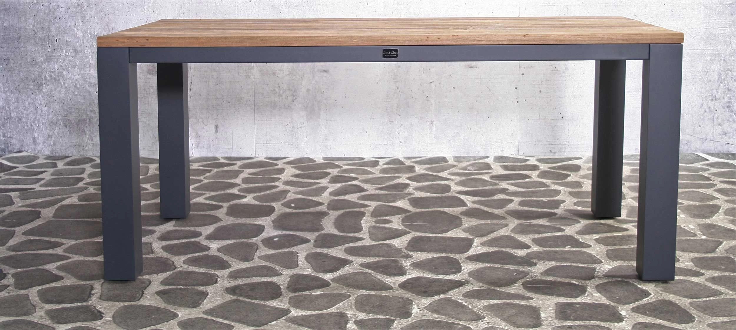 gerecycleerd teak combineert prachtig met de aluminium poten. Dankzij haar