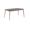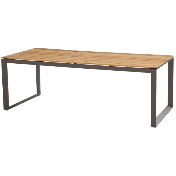 Tuintafel Herbert, gemaakt uit een onderstel van antracietkleurige staal en een tafelblad van massief teakhout. Meet 220 cm lang, 95 cm breed en 75 cm hoog.