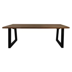 Tuintafel Lunas, gemaakt uit zwart metaal en teakhout. Beschikt over een lengte van 220 cm en een breedte van 100 cm.