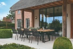 Tuintafel Margarite 250×110 cm, met zwart ijzeren frame en blad uit gerecycleerd massief teakhout.