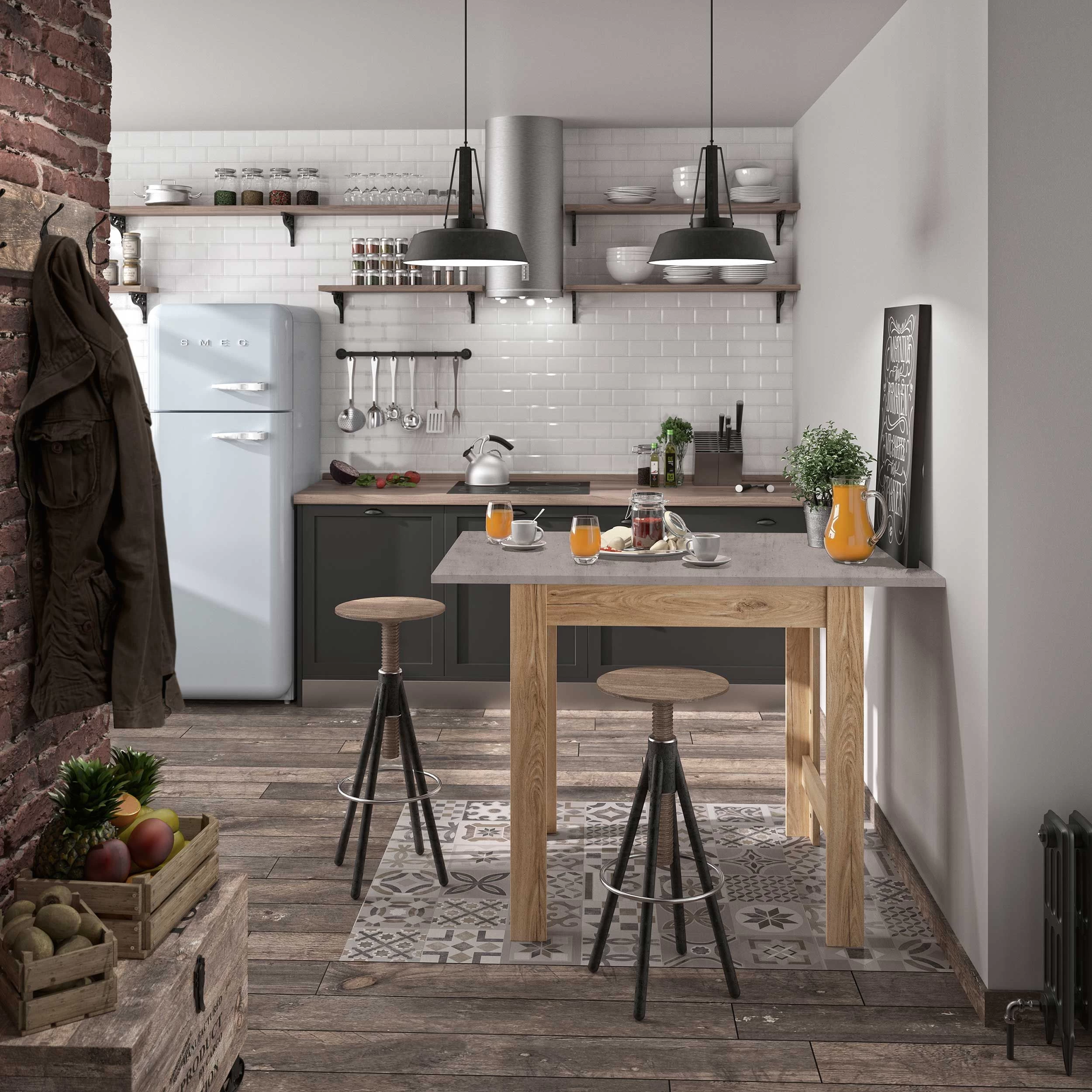 Deze bartafel kun je met behulp van het bijgeleverde verlengstuk uitbreiden van 91 cm tot 131 cm. Zo kunnen er in totaal 4 personen plaatsnemen aan de bartafel om in alle comfort te ontbijten. De tafel is gemaakt van spaanplaat met een imitatieprint van Helvezia eik/beton.