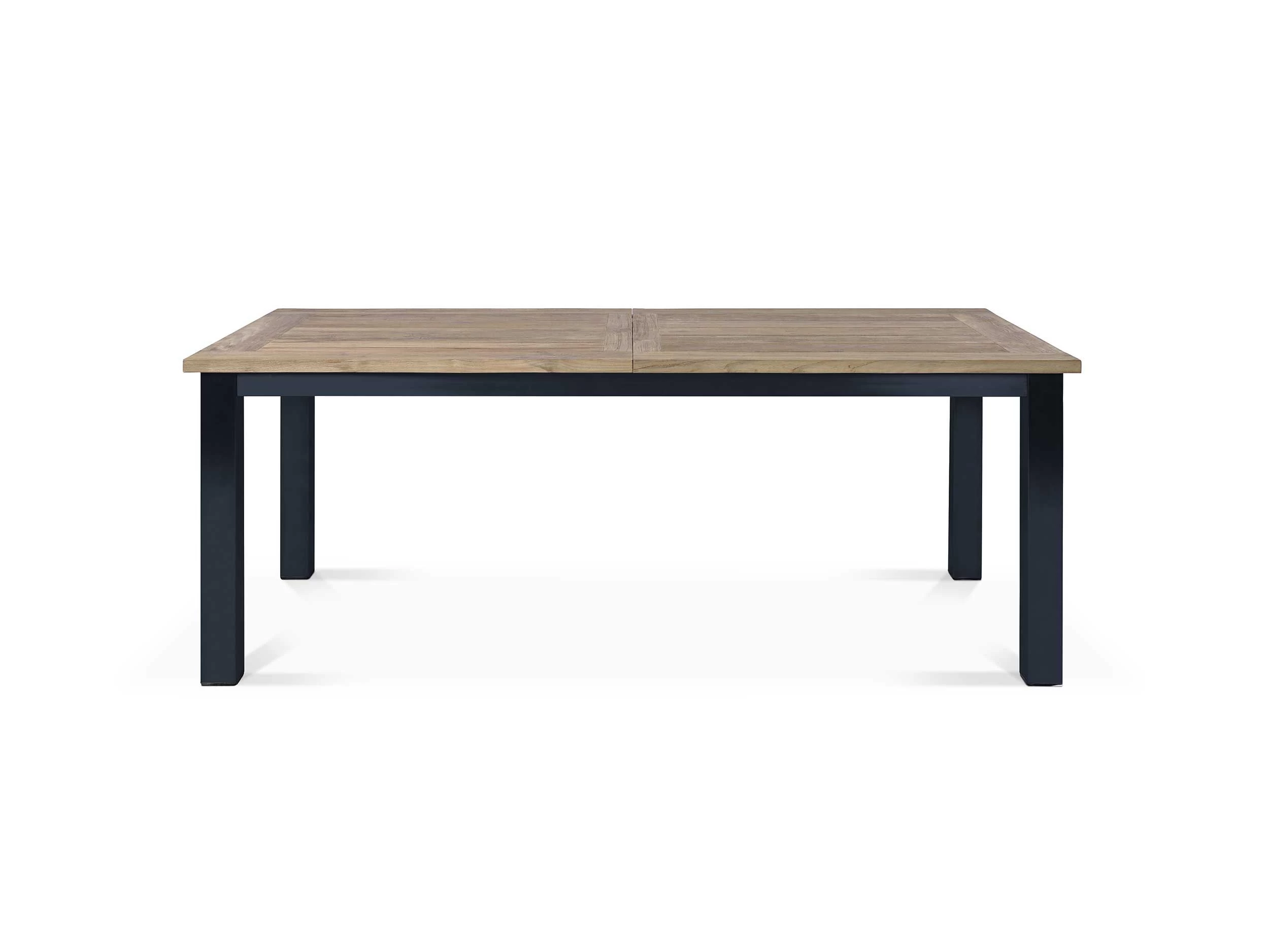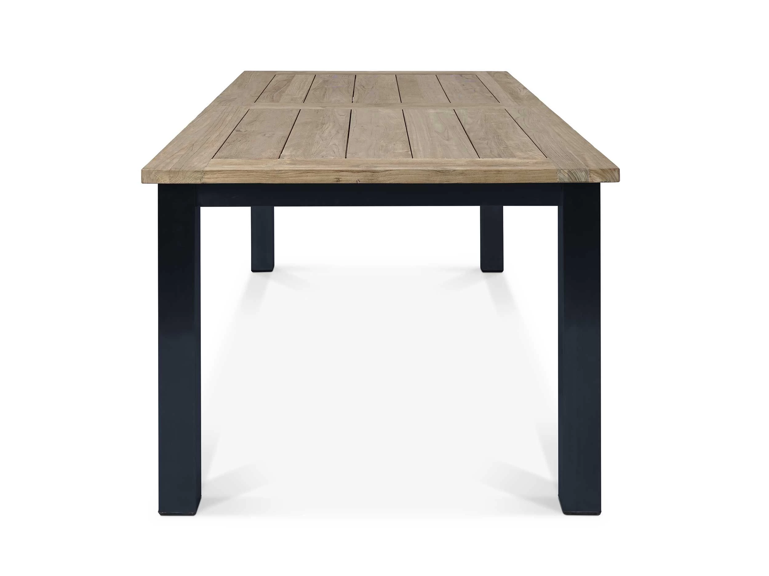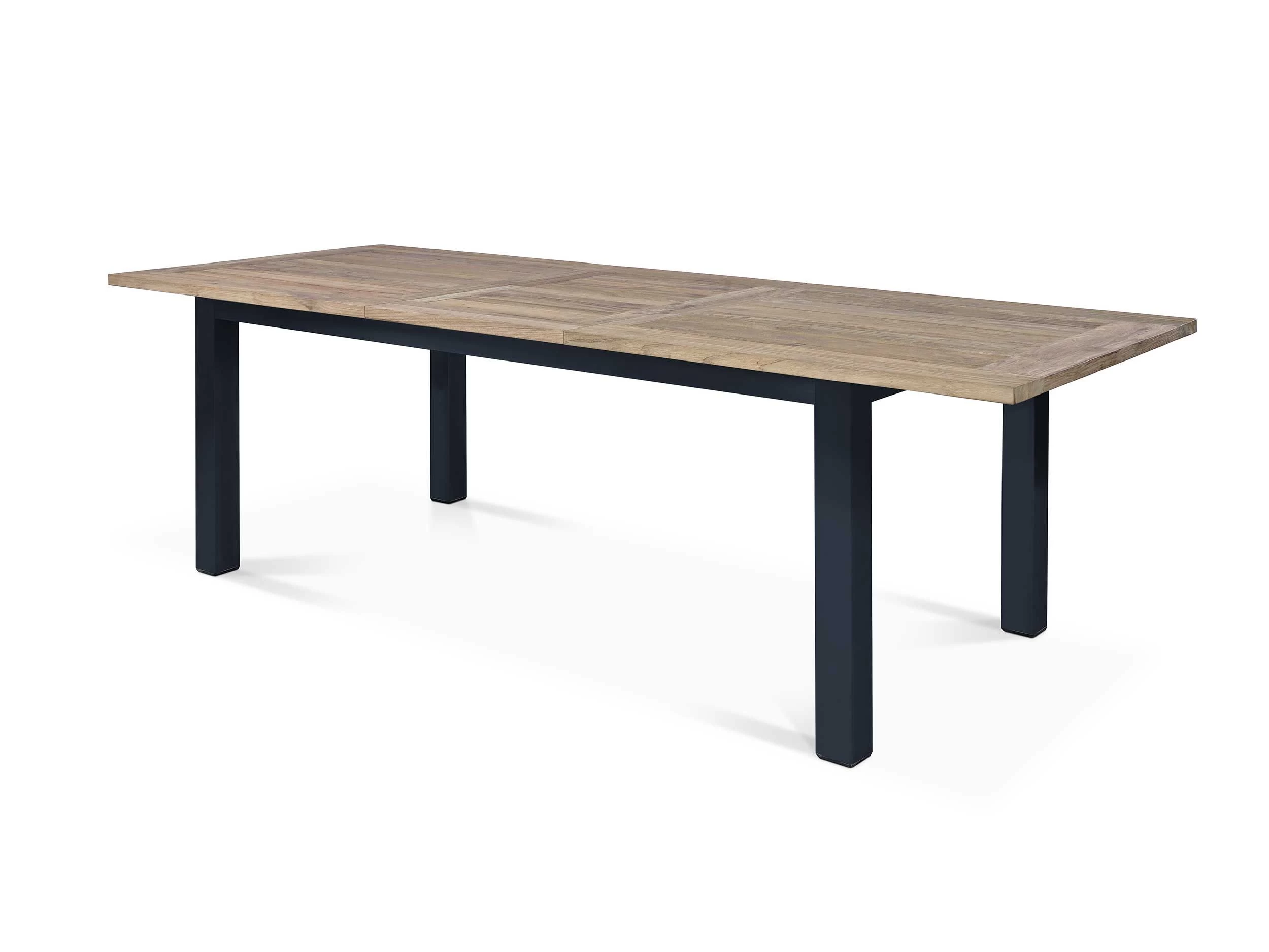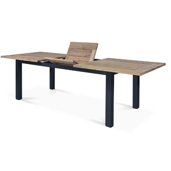 Verlengbare tuintafel Dalore, gemaakt uit teak hout met een onderstel uit matzwarte aluminium.