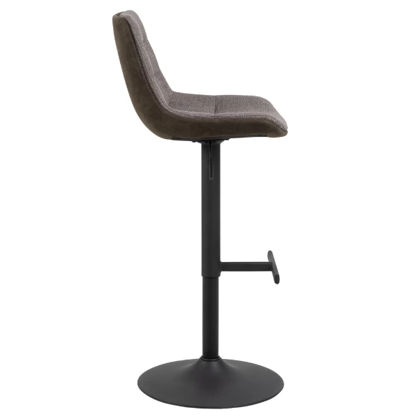 Gestoffeerde barkruk Adèle 47x52x95cm bekleed in grijze en antracietkleurige stof. Voet in zwart gepoedercoat staal. Draaibaar en in de hoogte verstelbaar met een zithoogte van 65 tot 86cm.