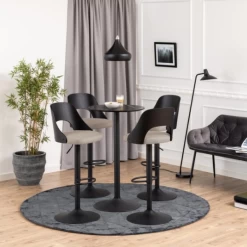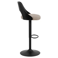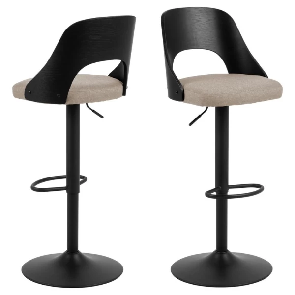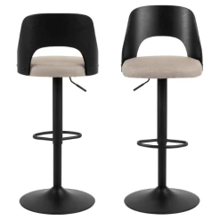 Wil je graag een plaats in je woonkamer creรซren waar je gezellig een drankje kunt drinken zonder dat hierbij de hele kamer in beslag genomen wordt? Dan is een kleine bartafel met bijpassende barstoelen ideaal. Deze Lucy-barstoelen zijn de perfecte aanvulling op een zwarte bartafel en zijn bovendien verstelbaar in hoogte. Daarnaast beschikken ze ook over een voetsteun. Barstoel Lucy heeft een zandkleurig zitkussen uit stof en een rugleuning uit zwartgelakt eikenfineer. Barstoel Lucy is ook verkrijgbaar met een donkergrijs zitkussen.