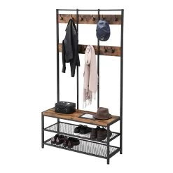 Gedaan met rondslingerende jassen en schoenen in huis, met deze vestiaire in je hal krijgen ze vanaf nu een vaste plaats! De vestiaire beschikt over 12 haken en een schoenenrek met 2 legplanken, waarop je kunt gaan zitten. De vestiaire combineert spaanplaat in rustiek bruin met zwart staal en geeft je hal een industrial feel.