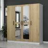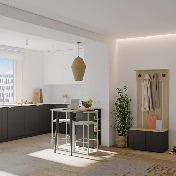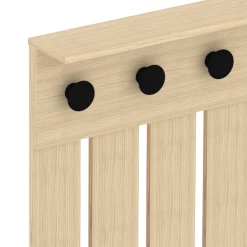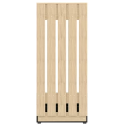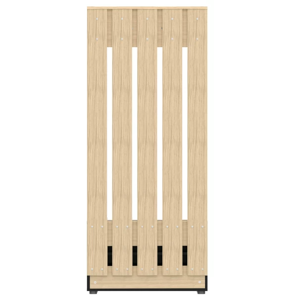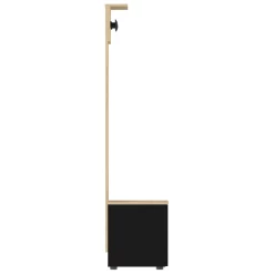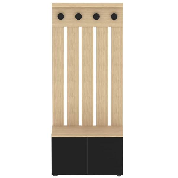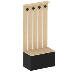 Vestiaire Dorothy is gemaakt uit gemelamineerde spaanplaat in zwart en lichte eik. De vestiaire bestaat uit 4 haken, 2 draaideuren en 2 legplanken.