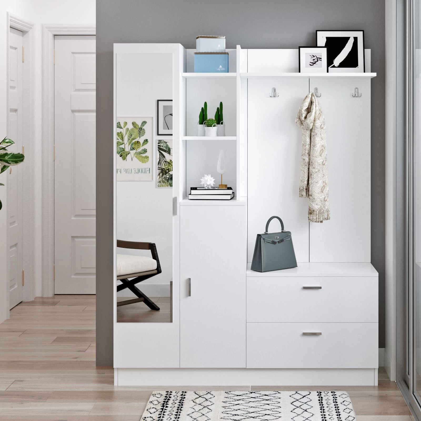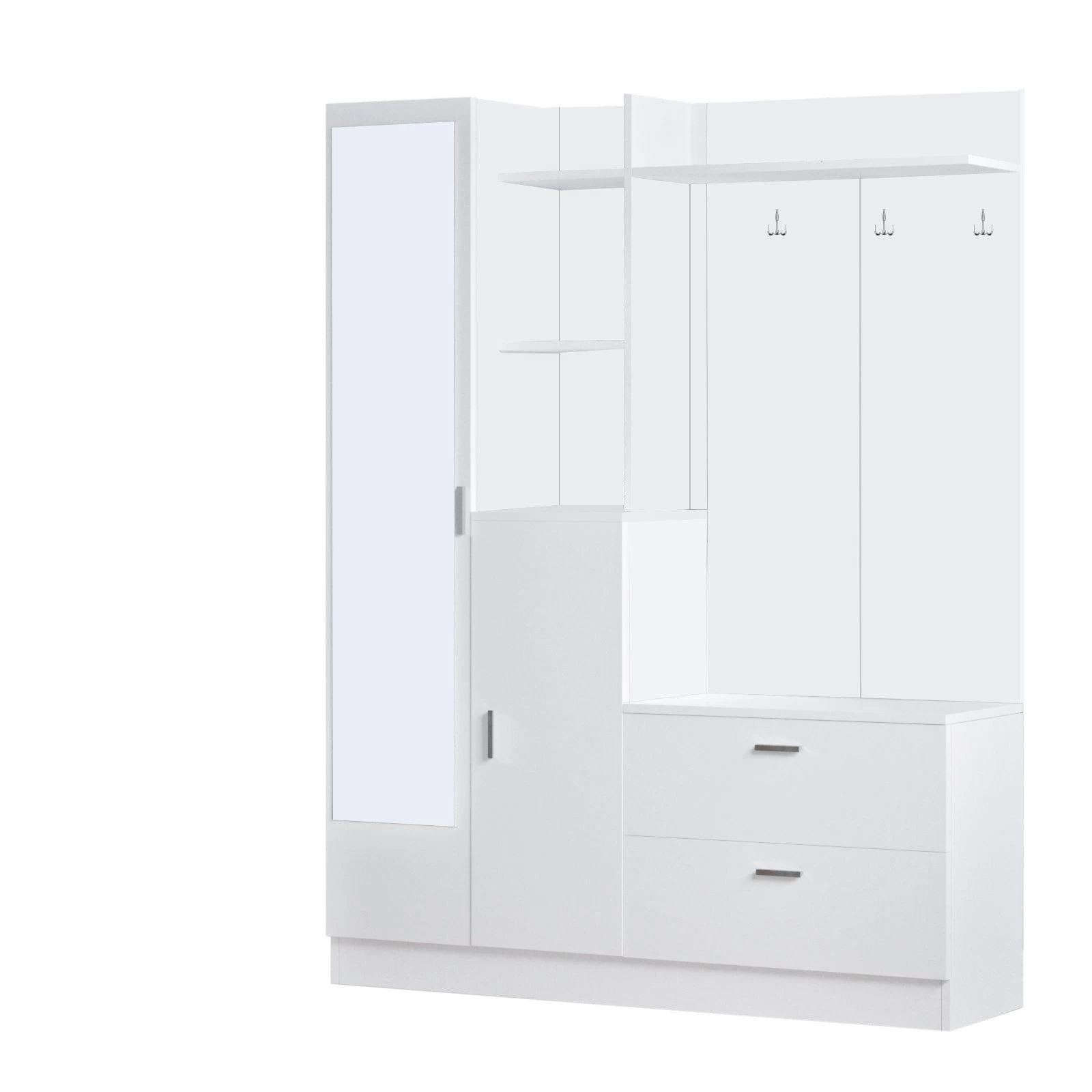 Vestiairemeubel Killian 140×36,80×181,80cm uit spaanplaat met afwerking in wit. Met een spiegeldeur en vier dubbele haken.