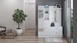 Geniet van een opgeruimde hal met de vestiairemeubels Killian. Deze vestiaire is gemaakt uit spaanplaat en afgewerkt in wit. Dankzij de vier dubbele haken heb je voldoende plaats om je jassen en tassen op te hangen. Achter de deuren zijn in totaal zes legplanken voorzien waardoor je schoenen, tassen, mutsen, sjaals en dergelijke kunt opbergen. Dankzij de spiegeldeur kan je nog snel je outfit controleren voordat je de deur uitgaat. De vestiaires Killian bestaan in verschillende uitvoeringen. Zo vind je zeker een exemplaar volledig naar jouw wensen.