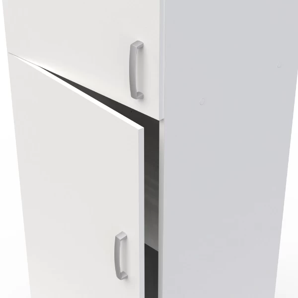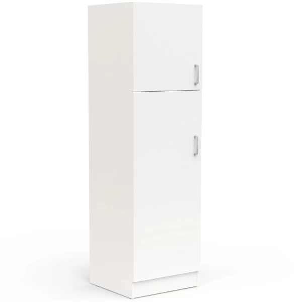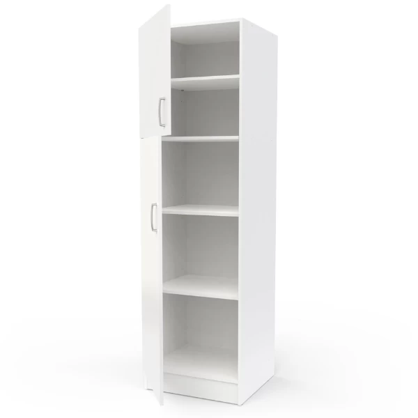Deze neutrale mat witte voorraadkast zal veel lichtinval creëren in uw keuken. Achter de 2 draaideuren zijn 5 opbergvakken die ruim voldoende opbergplaats bieden aan droge voeding en eventueel nog servies, keukengerei en kookboeken. Schroeven en pluggen voor wandmontage zijn niet inbegrepen.