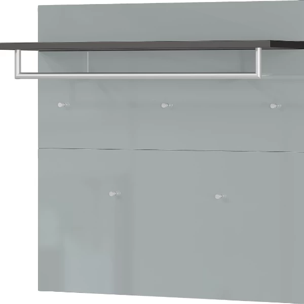 Functioneel elegant. Zo kan deze wandkapstok uit de Elio-reeks het beste omschreven worden. Door de combinatie van een paneel met een zilvergrijs, glazen front en een donkergrijze hoedenplank is deze wandkapstok een ware streling voor het oog. Daarnaast beschikt hij over alles wat je in een kapstok zoekt. Hij beschikt namelijk over een hoedenplank (max. 10 kg), een kledingroede (max. 10 kg) en 5 kledinghaakjes (max. 3 kg per haakje).