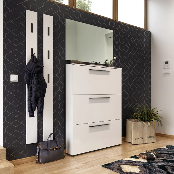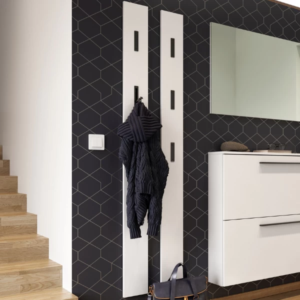 Met de collectie Jonas houdt u uw hal probleemloos op orde. De kapstok is gemaakt uit spaanplaat met afwerking in melamine in wit. De kapstok is uitgerust met drie uitklapbare metalen haken die elk tot 5kg belastbaar zijn. Dankzij het smalle formaat zijn de kapstokken Jonas ideaal voor compacte ruimtes zoals een smalle gang. De collectie is ook verkrijgbaar in kasjmier beige.