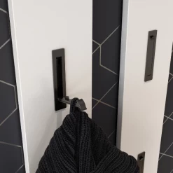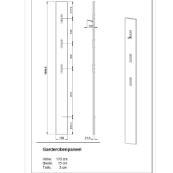 Wandkapstok Jonas 15x3x170cm uit spaanplaat met afwerking in wit. Met drie zwarte metalen haken.