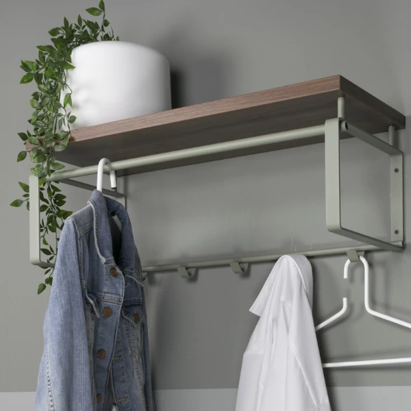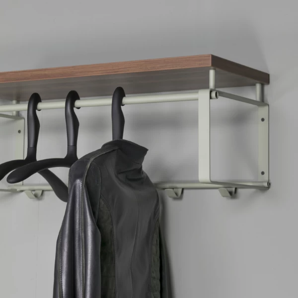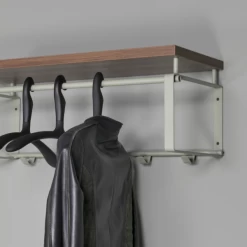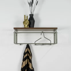 Wandkapstok Rayna is gemaakt uit staal en gemelamineerde spaanplaat met notenhout decor. De kapstok beschikt over 5 haken, een hoedenplank en een kledingroede.