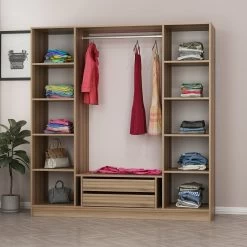 Investeren in deze kledingkast verbetert niet alleen de organisatie en esthetiek van je ruimte, maar zorgt ook voor tevredenheid op de lange termijn. Het gebruik van gemelamineerd spaanplaat draagt aanzienlijk bij aan de langere levensduur, omdat het bestand is tegen krassen, vocht en hitte. Deze kast is gemaakt om lang mee te gaan, waardoor je geld bespaart omdat je hem niet vaak hoeft te vervangen.