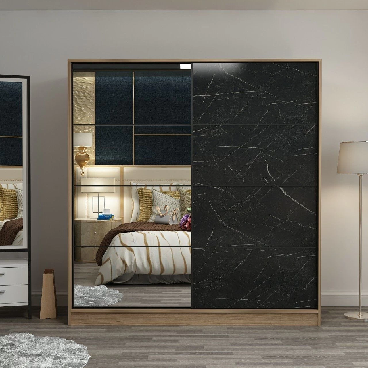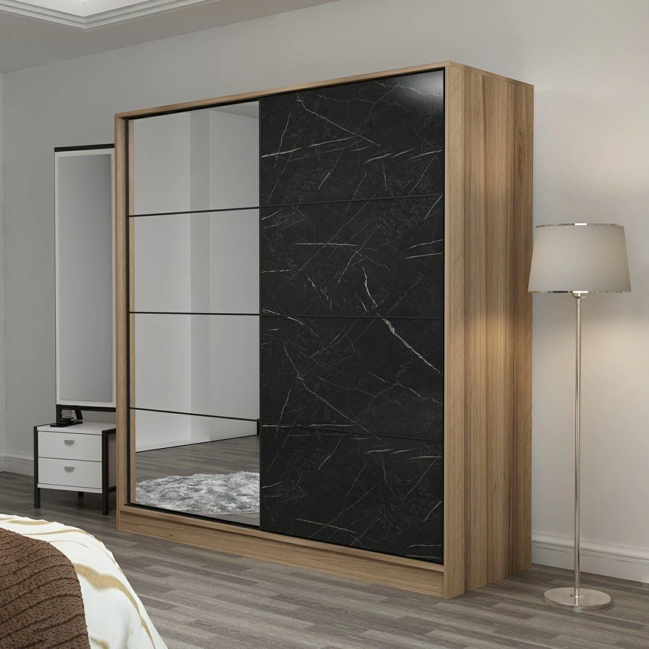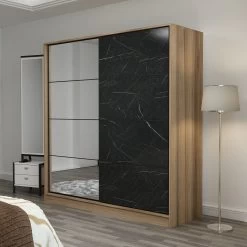 Dankzij de afmetingen van 180 cm breedte, 190 cm hoogte en 52 cm diepte past de kast perfect in elke kamer. Het strakke ontwerp en de kleurencombinatie van Dore Black zorgen ervoor dat hij naadloos past in elke interieurstijl.