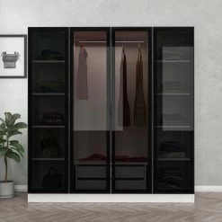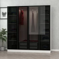 Binnenin vind je talloze planken waarmee je je kleding, accessoires en meer efficiënt kunt organiseren. Je hoeft niet meer te zoeken naar je favoriete outfit; alles kan nu netjes geordend worden in deze kledingkast.
